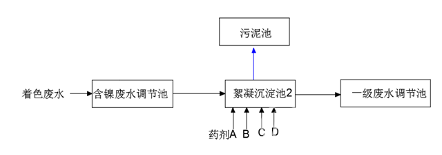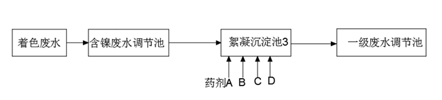 項目中含鎳廢水主要由著色工序產(chǎn)生,由于鎳是第一類污染物,必須車間排放口達標。項目擬對含鎳廢水單獨預處理,使總鎳車間排放口能達標,再將處理后的廢水匯入綜合調(diào)節(jié)池進行后續(xù)處理。含鎳離子廢水處理工藝原理如下: