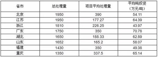 目前各地區(qū)設(shè)施建設(shè)能力相差較大,但單座設(shè)施平均規(guī)模相差不大,總處理量排名前六的省市分別為北京、江蘇、浙江、廣東、山東和湖北,其項(xiàng)目處理量占全部處理量的41.7%,說明對(duì)餐廚項(xiàng)目需求相對(duì)較強(qiáng)。除上述6省市外,項(xiàng)目處理量前8位的省市還包括福建和重慶。從區(qū)域分布來看,除湖北外,其它7省市均在沿海一帶或?yàn)橹陛犑校f明經(jīng)濟(jì)發(fā)達(dá)城市對(duì)餐廚垃圾處理的重視程度較高。