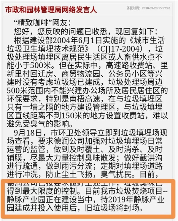 針對(duì)相關(guān)問題,市市政和園林管理局網(wǎng)絡(luò)發(fā)言人作出了回應(yīng),表示會(huì)進(jìn)一步督促垃圾填埋場(chǎng)的管理方加強(qiáng)對(duì)日常運(yùn)營的監(jiān)管工作。回復(fù)中還提及重要一點(diǎn)——