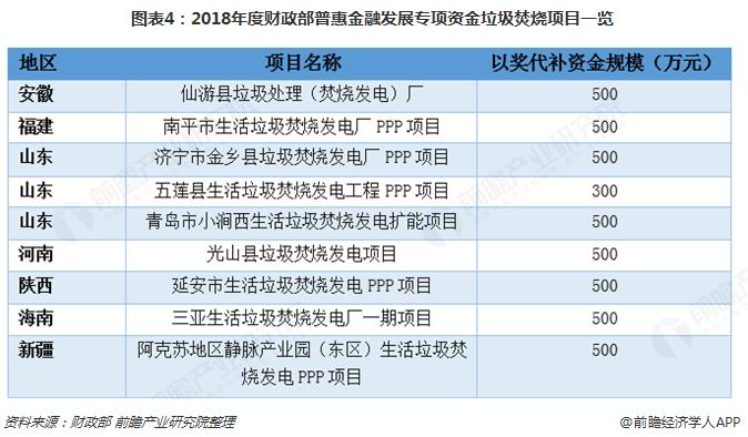 2018年10月12日,財(cái)政部發(fā)布《關(guān)于下達(dá)2018年度普惠金融發(fā)展專(zhuān)項(xiàng)資金預(yù)算的通知》,并隨文公布了獲得PPP項(xiàng)目以獎(jiǎng)代補(bǔ)資金項(xiàng)目名單,其中新建項(xiàng)目383個(gè),存量項(xiàng)目11個(gè)。涉及大批流域綜合治理、污水處理廠、生活垃圾焚燒發(fā)電,環(huán)衛(wèi)等環(huán)保領(lǐng)域項(xiàng)目。其中涉及生活垃圾處理的項(xiàng)目有20個(gè),包含9個(gè)垃圾焚燒項(xiàng)目。