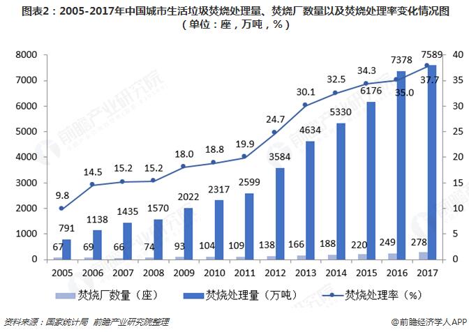 和傳統(tǒng)的堆肥、填埋等處理方式相比,焚燒具有處理效率高、占地面積小、對(duì)環(huán)境影響相對(duì)較小等優(yōu)點(diǎn),更能滿(mǎn)足城市生活垃圾處理對(duì)減量化和無(wú)害化的要求。并且焚燒處理的方式還能利用焚燒產(chǎn)生的熱能,實(shí)現(xiàn)垃圾的資源化,這些優(yōu)勢(shì)使得垃圾焚燒處理在近些年逐漸得到了較為廣泛的應(yīng)用與推廣。焚燒垃圾場(chǎng)的數(shù)量從2005年的67座增長(zhǎng)到2017年的278座,焚燒垃圾處理量由2005年的791萬(wàn)噸增長(zhǎng)到2017年的7589萬(wàn)噸。焚燒處理率由2005年的9.8%上升到2017年的37.7%。
