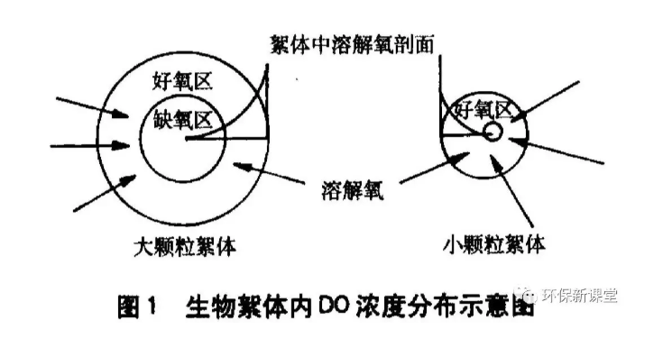 缺氧微環(huán)境理論是目前已被普遍接受的一種機理,被認(rèn)為是同步硝化/反硝化發(fā)生的主要原因之一。這一理論的基本觀點認(rèn)為:在活性污泥的絮體中,從絮體表面至其內(nèi)核的不同層次上,由于氧傳遞的限制原因,氧的濃度分布是不均勻的,微生物絮體外表面氧的濃度較高,內(nèi)層濃度較低。在生物絮體顆粒尺寸足夠大的情況下,可以在菌膠團內(nèi)部形成缺氧區(qū),在這種情況下,絮體外層好氧硝化菌占優(yōu)勢,主要進(jìn)行硝化反應(yīng),內(nèi)層為異樣反硝化菌占優(yōu)勢,主要進(jìn)行反硝化反應(yīng)(如圖1)。除了活性污泥絮凝體外,一定厚度的生物膜中同樣可存在溶氧梯度,使得生物膜內(nèi)層形成缺氧微環(huán)境。