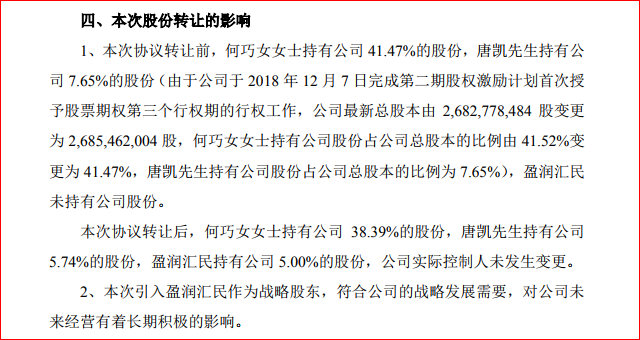 根據(jù)協(xié)議,何巧女將其持有的公司股份 82,935,718 股(占公司總股本的 3.09%)、唐凱將其持有的公司股份 51,337,383 股(占公司總股本的 1.91%),共計 134,273,101 股(占公司總股本的 5.00%)轉讓給盈潤匯民。
