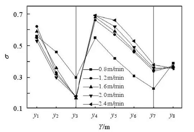 圖4是各個(gè)檢測(cè)面的相對(duì)均方根值對(duì)比。由圖4可以看出,濾袋與灰斗間區(qū)域(y1-y3),各工況在y1處相對(duì)均方根值??相差不多,沿除塵器從底部升高,呈現(xiàn)越接近濾袋區(qū)不均勻度越低,這說(shuō)明濾袋區(qū)對(duì)氣流的阻礙作用明顯,可使氣流均勻的進(jìn)入濾袋空間;在濾袋區(qū)(y4-y7),0.8m/min工況的相對(duì)均方根值明顯優(yōu)于其他工況,并且隨著過(guò)濾風(fēng)速的增大,相對(duì)均方根值σ逐漸增加;