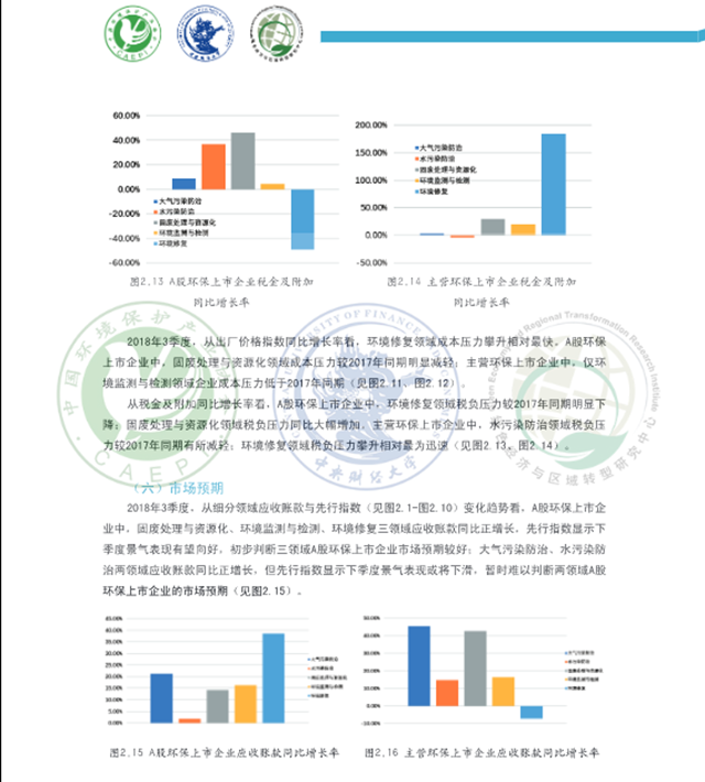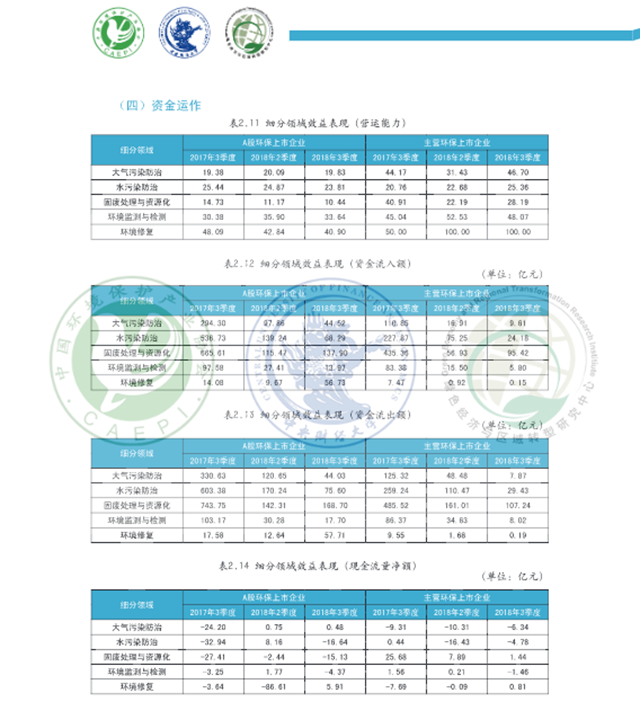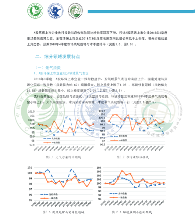 從細(xì)分領(lǐng)域看,A股環(huán)保上市企業(yè)2018年3季度各領(lǐng)域景氣表現(xiàn)呈現(xiàn)不同程度的回暖,主營環(huán)保上市企業(yè)在大氣污染防治、水污染防治、環(huán)境監(jiān)測和檢測三領(lǐng)域景氣表現(xiàn)回升。固廢處理與資源化領(lǐng)域規(guī)模較2017年同期有所擴(kuò)大, A股環(huán)保上市企業(yè)稅負(fù)壓力同比大幅增加,成本壓力較去年同期明顯減輕,預(yù)計該領(lǐng)域下季度景氣有望上行:大氣污染防治領(lǐng)域資金外流和國款情況較2017年同期有所改善,預(yù)計該領(lǐng)域A股環(huán)保上市企業(yè)下季度景氣表現(xiàn)下滑,主營環(huán)保上市企業(yè)下季度景氣有望上行:環(huán)境監(jiān)測與檢測領(lǐng)域規(guī)模較上季度呈擴(kuò)張態(tài)勢, 效益表現(xiàn)總體優(yōu)于上季度,下季度該領(lǐng)域景氣表現(xiàn)有望上行:環(huán)境修復(fù)領(lǐng)域營運能力、現(xiàn)金流量凈額和流動性表現(xiàn)相對較好,A股環(huán)保上市企業(yè)稅負(fù)壓力較去年同期大幅下降,主營環(huán)保上市企業(yè)稅負(fù)壓力快速攀升,預(yù)計下季度A股環(huán)保上市企業(yè)景氣表現(xiàn)小幅上行,主營環(huán)保上市企業(yè)景氣或?qū)⑾禄核廴痉乐晤I(lǐng)域利潤總額、流動性不及去年同期和上季度,A股環(huán)保上市企業(yè)成本壓力較去年同期有所減輕,主營環(huán)保上市企業(yè)稅負(fù)壓力同比小幅減輕,預(yù)計該領(lǐng)域下季度景氣表現(xiàn)下行。