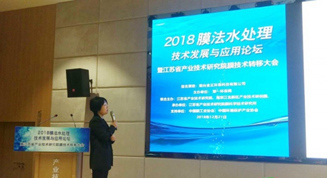 這次“2018膜法水處理技術(shù)發(fā)展與應(yīng)用論壇暨江蘇省產(chǎn)業(yè)技術(shù)研究院膜技術(shù)轉(zhuǎn)移大會”,來自金正環(huán)保的研發(fā)總監(jiān),苗晶博士對煙臺金正環(huán)保做了簡要介紹,著重介紹了金正環(huán)保在高難廢水處理領(lǐng)域所擁有的特有技術(shù)、設(shè)備、及實際案例。在上游膜材料方面,著重介紹了金正環(huán)保在膜材料方面已取得的進展,包括低壓納濾膜、中空纖維納濾膜、雜化膜材料等。