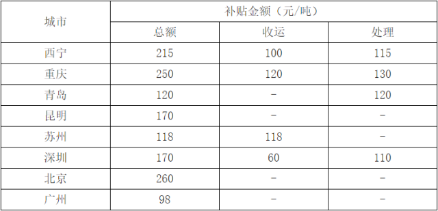 我國(guó)部分城市餐廚運(yùn)營(yíng)補(bǔ)貼