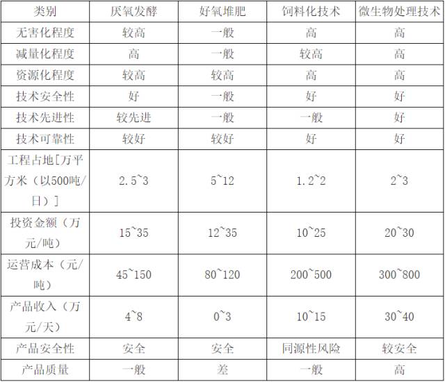 2)從經(jīng)濟(jì)效益比較,我們以日處理規(guī)模為500t計(jì)算,盡管資源化處理的費(fèi)用最高,但其總收益也最大,綜合來(lái)看年均收益能達(dá)到 1435 萬(wàn)元。資源化處理方式又細(xì)分為厭氧發(fā)酵、好氧堆肥、直接烘干做飼料和微生物處理等。