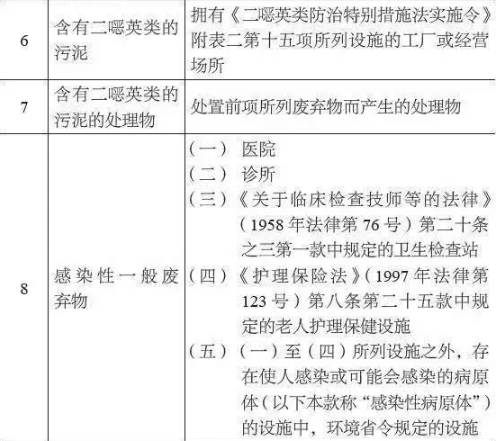 有別于歐美的廢物名錄管理體系,目前日本尚未形成一個完整的分類目錄,且沒有廢物代碼等信息?!稄U棄物處理法》根據(jù)廢物來源將廢物分為特別管理產(chǎn)業(yè)廢棄物和特別管理一般廢棄物。特別管理產(chǎn)業(yè)廢棄物是指產(chǎn)業(yè)廢棄物中具有爆炸性、毒性、感染性及其他可能危害人體健康或者生活環(huán)境性狀,而以政令規(guī)定的廢棄物(見表9)。特別管理一般廢棄物是指一般廢棄物中具有爆炸性、毒性、感染性及其他可能危害人體健康或者生活環(huán)境性狀,而以政令規(guī)定的廢棄物(見表10)。