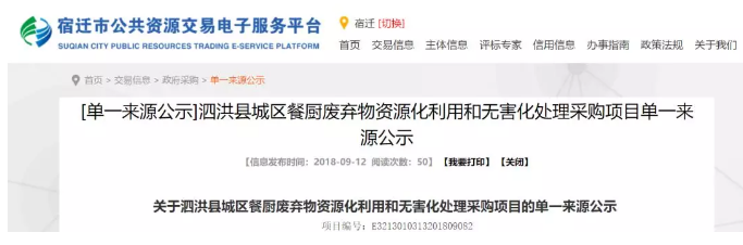 目前(宿城管發(fā)(2018)24號)文件要求,全市餐廚廢棄物處理(PPP)項(xiàng)目已由中國光大國際有限公司中標(biāo)承建,其中二期工程2019年后才能覆蓋到我縣,針對我縣餐廚現(xiàn)狀及城管局核算,運(yùn)送到市里統(tǒng)一處理成本低(與市區(qū)同價(jià))操作可行。該公司具有該項(xiàng)目環(huán)??萍汲晒b定證書,且省市領(lǐng)導(dǎo)均建議由該公司統(tǒng)一處理全市餐廚廢棄物。故我縣餐廚廢棄物送中國光大國際有限公司(光大環(huán)保餐廚處理宿遷有限公司)處理,符合單一來源要求。