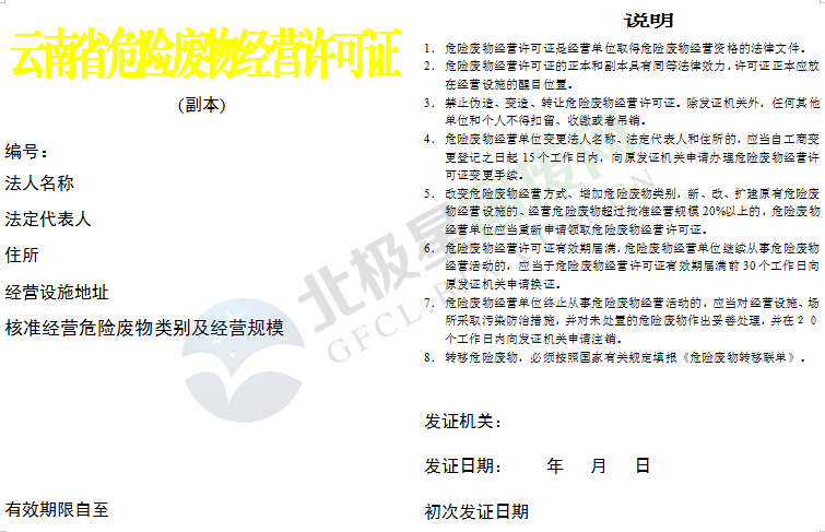3.其他危險(xiǎn)廢物綜合經(jīng)營(yíng)許可證,由云南省環(huán)境保護(hù)廳審批頒發(fā)。