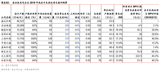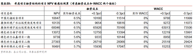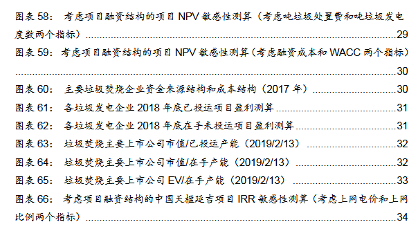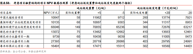 典型項(xiàng)目的NPV考慮項(xiàng)目融資結(jié)構(gòu)的項(xiàng)目NPV測算:我們假設(shè)項(xiàng)目的資本結(jié)構(gòu)為70%債務(wù),30%自有資金,參考中國天楹/綠色動力的公司財務(wù)狀況,假設(shè)其項(xiàng)目的債務(wù)資金的綜合成本分別為6.5%/5.6%,各個項(xiàng)目每年將新增部分財務(wù)費(fèi)用。依據(jù)之前的投資數(shù)據(jù)和現(xiàn)金流數(shù)據(jù),我們計算得到各個項(xiàng)目考慮融資杠桿后的NPV,其中最高的為康恒寧波項(xiàng)目,其NPV為6.8億元,主要是因?yàn)槠鋰嵗幹觅M(fèi)高于其他所有項(xiàng)目,并且噸垃圾發(fā)電量也處于相對較高水平;而天楹延吉項(xiàng)目、康恒廣水項(xiàng)目、綠色動力海寧、綠色動力永嘉項(xiàng)目一期的NPV均較低,分別為1.08億元、1.01億元、1.31億元、0.97億元,主要因?yàn)榍皟蓚€項(xiàng)目的噸垃圾處置費(fèi)和噸垃圾發(fā)電量均較低,而后兩個項(xiàng)目的噸垃圾處置費(fèi)較低。我們再次計算了各項(xiàng)目的單位產(chǎn)能NPV,發(fā)現(xiàn)天楹延吉項(xiàng)目、康恒廣水項(xiàng)目、綠色動力永嘉項(xiàng)目一期的該指標(biāo)分別僅有13.56萬元/噸、16.89萬元/噸、19.48萬元/噸,而康恒寧波項(xiàng)目、綠色動力永嘉項(xiàng)目二期、綠色動力海寧項(xiàng)目則分別達(dá)到30.24萬元/噸、28.83萬元/噸、26.14萬元/噸,再一次反映了后三個項(xiàng)目相對更高的噸垃圾處置費(fèi)和噸垃圾發(fā)電量所帶來的更高的項(xiàng)目價值。根據(jù)我們的敏感性分析,假設(shè)垃圾處置費(fèi)增加5元/噸,各個垃圾發(fā)電項(xiàng)目的NPV增加410-2809萬元;噸垃圾發(fā)電增加20千瓦時/噸,各個項(xiàng)目的NPV增加區(qū)間為611-4830萬元。我們考慮融資成本和WACC兩個指標(biāo)再次對各個項(xiàng)目的NPV進(jìn)行敏感性分析,發(fā)現(xiàn)融資成本增加0.3pct時, 各個項(xiàng)目的NPV降低322萬元-2120萬元;WACC增加0.5pct時,各個項(xiàng)目的NPV降低789萬元-5033萬元。