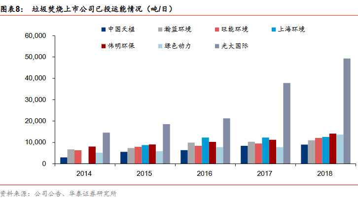 按上市公司規(guī)劃的投產(chǎn)進(jìn)度,2019-2020年為投產(chǎn)高峰期,2019-2020年新增投運(yùn)產(chǎn)能同比增速將高達(dá)24%、72%;18-20年累計投運(yùn)增速24%/24%/33%,高成長可期。上述典型垃圾焚燒上市公司的規(guī)劃新增產(chǎn)能將在2019-2020年間大規(guī)模釋放,目前處于在建和籌建階段的項(xiàng)目將會集中投產(chǎn),預(yù)計2019-2020年新增投運(yùn)總產(chǎn)能將分別達(dá)到2.9萬噸/日、5.0萬噸/日;其中光大國際、綠色動力、旺能環(huán)境、中國天楹、上海環(huán)境等新增產(chǎn)能居前。