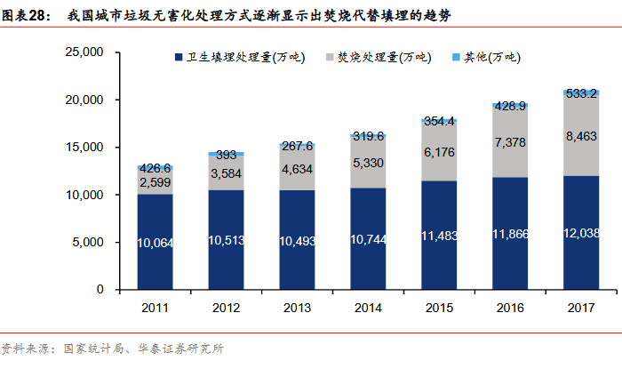 驅(qū)動因素二:土地有限,鄰避效應(yīng)減弱驅(qū)使填埋轉(zhuǎn)焚燒在我國,垃圾焚燒相比于填埋方式優(yōu)勢顯著,更受政策鼓勵。我國主要垃圾處理方式有衛(wèi)生填埋、焚燒發(fā)電和堆肥等三種方式。衛(wèi)生填埋是目前我國城市垃圾處理的主導(dǎo)方式,但存在二次污染隱患;堆肥方式在我國已逐漸退出,具有項(xiàng)目建設(shè)成本高、效益低、存在重金屬污染等問題,處理規(guī)模受到限制;相比之下,垃圾焚燒方式不僅污染控制標(biāo)準(zhǔn)已與國際標(biāo)準(zhǔn)(GB標(biāo)準(zhǔn))接軌,經(jīng)濟(jì)效益也遠(yuǎn)優(yōu)于衛(wèi)生填埋,具有盈利模式清晰,市場化程度高,可持續(xù)等優(yōu)勢,因此具有較大發(fā)展空間。根據(jù)國家統(tǒng)計局統(tǒng)計數(shù)據(jù),“十二五”期間我國垃圾焚燒處理能力增長了149.7%。“十二五”末垃圾焚燒處理量占垃圾無害化處理量34%,復(fù)合增速為22%,衛(wèi)生填埋處理量垃圾無害化處理64%,復(fù)合增速為4%,“十二五”期間垃圾焚燒處理量增速顯著高于衛(wèi)生填埋處理量增速。
