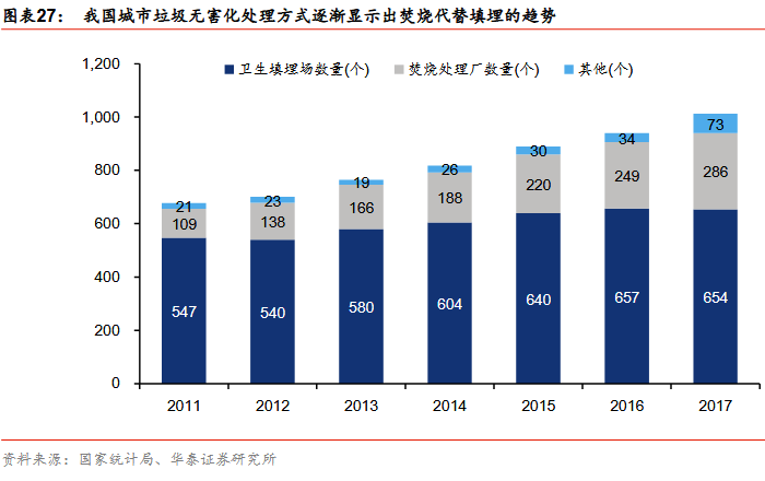 我國垃圾填埋占比下降,焚燒發(fā)電仍處于成長期。根據(jù)E20研究院最新統(tǒng)計數(shù)據(jù),城市垃圾填埋場的規(guī)模逐漸減小,由2008年的622噸/日座降至2016年的533噸/日座,城市生活垃圾處理方式正在由衛(wèi)生填埋向垃圾焚燒發(fā)電轉(zhuǎn)變,填埋場處理對象從生活垃圾向焚燒殘渣轉(zhuǎn)變。