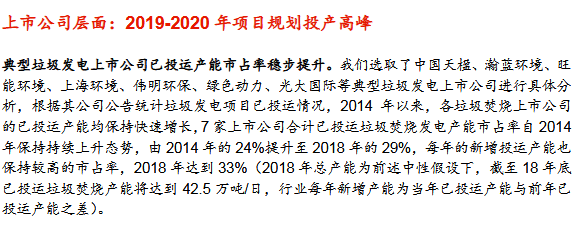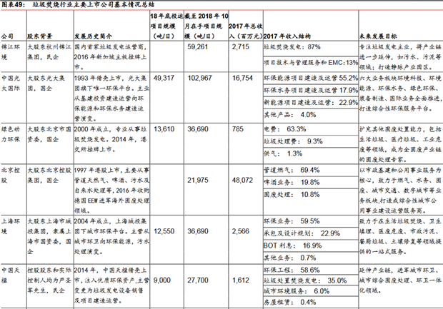 競爭格局:集中度較高,國企競爭力增強(qiáng)根據(jù)2018年10月的垃圾焚燒項(xiàng)目在手規(guī)模排序,目前垃圾焚燒行業(yè)主要的參與者包括:1)國企:光大國際、中國環(huán)境保護(hù)集團(tuán)、綠色動力環(huán)保、皖能環(huán)保、康恒環(huán)境、北京控股、重慶三峰、上海環(huán)境、啟迪桑德、廣州環(huán)保、瀚藍(lán)環(huán)境等;2)民企:錦江環(huán)境、盛運(yùn)環(huán)保、中國