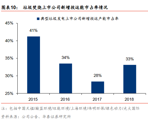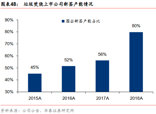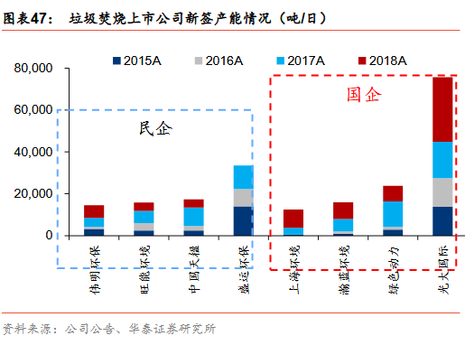 新增訂單趨勢:國企拿單能力強(qiáng)于民企。我們對光大國際、綠色動力、瀚藍(lán)環(huán)境、上海環(huán)境、盛運(yùn)環(huán)保、中國天楹、旺能環(huán)境、偉明環(huán)保幾家典型垃圾發(fā)電上市公司2015-2018年新簽訂單進(jìn)行分析,其中光大國際、綠色動力、瀚藍(lán)環(huán)境、上海環(huán)境四家國企2015年新簽訂單1.8萬噸/日,占8家上市公司新簽訂單總產(chǎn)能的45%,2016年提升至52%、2017年繼續(xù)提升至56%,2018年四家國企新簽訂單總產(chǎn)能為5.5萬噸/日,占比提升至80%,國企拿單能力顯著強(qiáng)于民企。