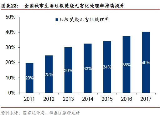 驅(qū)動因素一:需求的持續(xù)擴(kuò)張垃圾焚燒發(fā)電行業(yè)持續(xù)擴(kuò)張主要推動因素包括:1)垃圾產(chǎn)生量和清運(yùn)量持續(xù)提升:我國城市垃圾清運(yùn)量由2011年的1.64億噸上升到2017年的2.15億噸,年均復(fù)合增速4.6%,城鎮(zhèn)化的持續(xù)推進(jìn)、生活水平的逐步提高,我們認(rèn)為,城市垃圾產(chǎn)生量和清運(yùn)量仍將保持增長;2)垃圾焚燒占有率快速提升,垃圾焚燒占生活垃圾無害化處理量的比例從2011年的20%增長到2017年的40%。