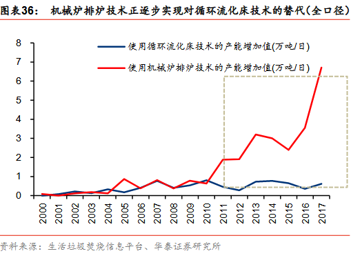 國際上機(jī)械爐排爐技術(shù)已經(jīng)非常成熟并且被廣泛使用,相比循環(huán)流化床技術(shù),機(jī)械爐排爐技術(shù)擁有單臺焚燒爐的垃圾處理量大、進(jìn)料垃圾不需要進(jìn)行預(yù)處理、對垃圾的成分要求低、污染物排放和灰渣熱灼減率等指標(biāo)更易達(dá)標(biāo)、燃燒狀態(tài)穩(wěn)定、運(yùn)行成本低、年運(yùn)行時間長、操作簡便等優(yōu)勢。而國內(nèi)2012年發(fā)布的《國家發(fā)展改革委關(guān)于完善垃圾焚燒發(fā)電價格政策的通知》和2014年發(fā)布的《生活垃圾焚燒污染控制標(biāo)準(zhǔn)》等政策也使得循環(huán)流化床技術(shù)的運(yùn)行成本增加,因而近年來機(jī)械爐排爐技術(shù)正在逐步實(shí)現(xiàn)對循環(huán)流化床技術(shù)的替代。
