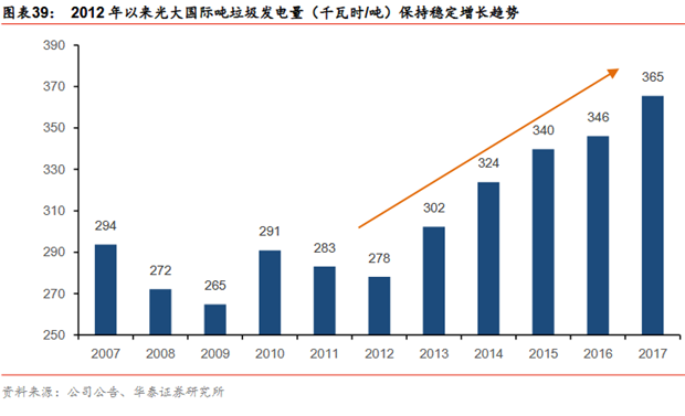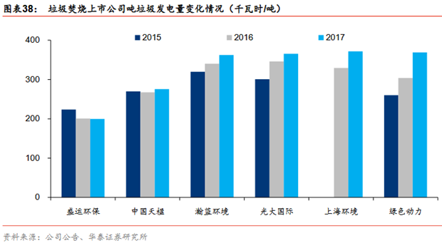 垃圾分類+技術(shù)的進(jìn)步=噸垃圾發(fā)電量提升,上市公司層面可以觀察到幾家典型垃圾發(fā)電企業(yè)在2015-2017年噸垃圾發(fā)電量顯著提升,其中綠色動力、光大國際分別由16年的260千瓦時/噸、301千瓦時/噸提升至17年的369千瓦時/噸、365千瓦時/噸。長周期來看,光大國際噸垃圾發(fā)電量由2012年的278千瓦時/噸提升至2017年的365千瓦時/噸,提升幅度明顯。