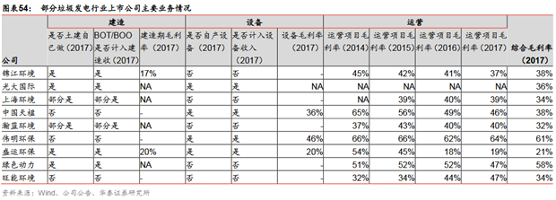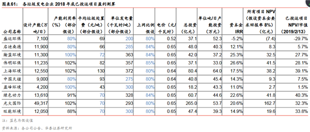項(xiàng)目達(dá)產(chǎn)后主要收入來自發(fā)電收入,主要成本來自折舊、原材料和人工:首先假設(shè)該項(xiàng)目資金100%來自自有資金投資的情況下,則項(xiàng)目主要的收入、成本情況如下:1)收入:垃圾處置收入+發(fā)電收入。項(xiàng)目達(dá)產(chǎn)后,滿產(chǎn)狀態(tài)下可得出項(xiàng)目的年垃圾處理量,按照各個項(xiàng)目的垃圾處置費(fèi)(所列項(xiàng)目中最高為康恒寧波項(xiàng)目的149元/噸,最低為中國天楹延吉項(xiàng)目的58元/噸),則項(xiàng)目除增值稅后可測得年垃圾處置收入;按照0.65元/度的發(fā)電收入(部分項(xiàng)目比如康恒寧波項(xiàng)目、綠色動力永嘉、綠色動力海寧項(xiàng)目為0.66元/度),結(jié)合各項(xiàng)目噸垃圾發(fā)電量(所列項(xiàng)目中最高為綠色動力海寧項(xiàng)目的410度/噸,最低為中國天楹延吉項(xiàng)目的280度/噸),結(jié)合個項(xiàng)目的上網(wǎng)比例(79%-85%之間),可測得扣除增值稅后年垃圾發(fā)電收入;可以看出,噸垃圾處置費(fèi)和噸垃圾發(fā)電量是決定收入端的主要變量。2)成本:以中國天楹延吉項(xiàng)目為例,根據(jù)其非公開發(fā)行報告書披露,成本構(gòu)成中折舊占比47%(天楹按照資產(chǎn)預(yù)計使用壽命與該BOT項(xiàng)目特許經(jīng)營權(quán)協(xié)議規(guī)定的經(jīng)營期孰低確定,基本上折舊年限在20年)、原材料占比20%、工資及福利占比15%、維護(hù)費(fèi)用(考慮大修、年修及日常維護(hù)費(fèi)用)占比11%、污水及爐渣處置占比7%??傮w來看,成本端中折舊攤銷、原材料和人工占比在80%左右。