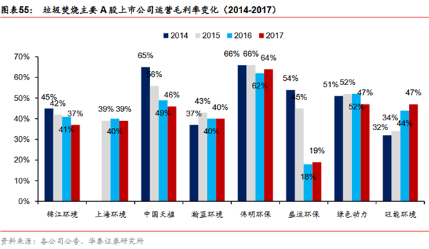 上市公司會計政策差異:垃圾焚燒會計處理方法各不相同。下面我們選取了行業(yè)里一些主要的上市公司分析,匯總?cè)缦卤恚渲校築OT計入工程收入的主要有錦江環(huán)境、光大國際、上海環(huán)境、瀚藍(lán)環(huán)境、盛運(yùn)環(huán)保、綠色動力;BOT計入設(shè)備銷售收入的主要有:光大國際、中國天楹、偉明環(huán)保、盛運(yùn)環(huán)保,其中偉明環(huán)保的設(shè)備銷售的毛利率較高,大約在46%左右;各公司的運(yùn)營毛利率有一定差異,大部分公司2016年毛利率出現(xiàn)了同比下滑,預(yù)計由于新投運(yùn)項(xiàng)目的盈利能力不如老項(xiàng)目所致。其中偉明環(huán)保垃圾發(fā)電項(xiàng)目毛利率高出行業(yè)平均較多,主要是因?yàn)樵O(shè)備折舊費(fèi)用少,設(shè)備折舊費(fèi)用可以占到垃圾焚燒成本的40%-50%,而偉明環(huán)保的設(shè)備折舊較少主要有兩點(diǎn)原因:1)偉明環(huán)保自產(chǎn)爐排爐設(shè)備,同時不計設(shè)備銷售收入,因此在在建工程確認(rèn)時并不包含設(shè)備毛利(一般設(shè)備毛利率約40%),因此最終轉(zhuǎn)入無形資產(chǎn)特許經(jīng)營權(quán)的金額比其他公司大約節(jié)省了40%的設(shè)備投資;2)偉明環(huán)保采取的折舊方法是按照特許經(jīng)營權(quán)年限折舊,按照2016年特許經(jīng)營權(quán)折舊的數(shù)據(jù)估計,綜合折舊年限在25年,折舊年限長于啟迪桑德、瀚藍(lán)環(huán)境、中國天楹、光大國際(這些公司采取特許經(jīng)營權(quán)和資產(chǎn)使用年限孰短的方法折舊,一般綜合折舊年限為20年)。