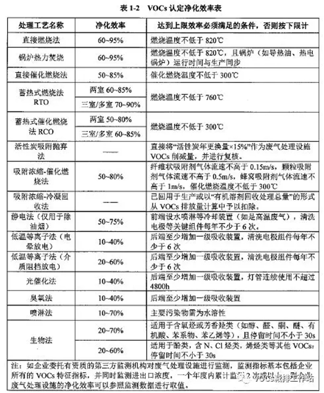 如上是2016年河北地標(biāo)(DB 13/ 2322—2016)在一些行業(yè)對(duì)非甲烷總烴去除率的要求,其他地方標(biāo)準(zhǔn)都有類似的要求。一些地方性的文件對(duì)某類工藝的處理效率已作直接認(rèn)定,如《浙江省重點(diǎn)行業(yè)VOCs污染排放源排放量計(jì)算方法》中對(duì)各類工藝的處理效率認(rèn)定如下: