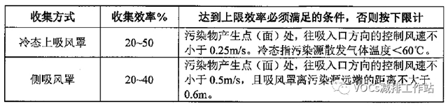 去除率是常見的技術(shù)要求指標(biāo),一些工程還要求對(duì)VOCs治理過程中的前端收集效率有要求,收集效率是個(gè)理論值,在監(jiān)測(cè)時(shí)怎么論證或體現(xiàn)收集效率數(shù)值,即如何認(rèn)定或者直接測(cè)量出來?有些同行反饋雖然某些地方是雙90的要求,但監(jiān)管單位針對(duì)收集效率的要求也是應(yīng)收盡收,但并沒有直接正面給與答復(fù)。那是否收集效率僅是方便環(huán)境統(tǒng)計(jì)管理,不具備實(shí)際的工程和監(jiān)測(cè)意義?同樣,如《浙江省重點(diǎn)行業(yè)VOCs污染排放源排放量計(jì)算方法》中對(duì)各類收集方式的收集效率認(rèn)定如下: