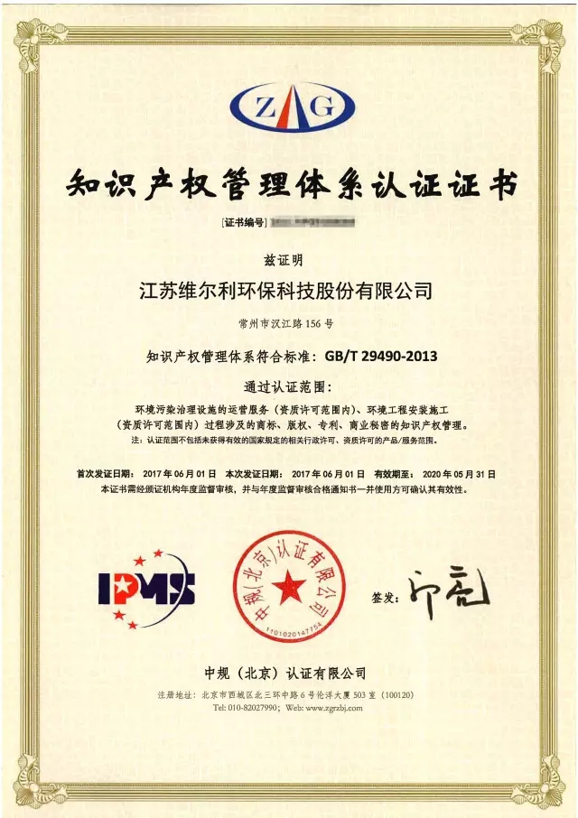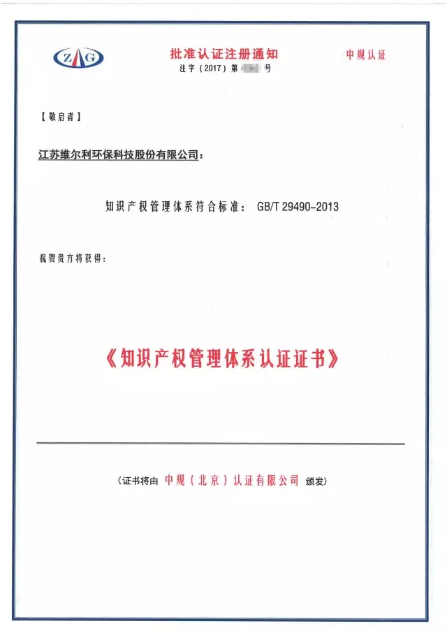 2017年6月,江蘇維爾利環(huán)??萍脊煞萦邢薰卷樌ㄟ^認證,獲得GB/T29490-2013知識產(chǎn)權管理體系認證證書。