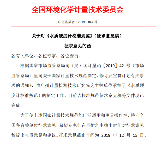 2019年11月9日,全國環(huán)境化學計量技術(shù)委員會發(fā)布《水質(zhì)硬度計校準規(guī)范》(征求意見稿),向全國各有關(guān)單位征求意見。