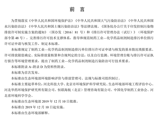 為貫徹落實《中華人民共和國環(huán)境保護法》《中華人民共和國大氣污染防治法》《中華人民共和國水污染防治法》《中華人民共和國土壤污染防治法》等法律法規(guī)、《國務院辦公廳關于印發(fā)控制污染物排放許可制實施方案的通知》(國辦發(fā)〔2016〕81號)和《排污許可管理辦法(試行)》(環(huán)境保護部令第48號),完善排污許可技術(shù)支撐體系,指導和規(guī)范制藥工業(yè)—化學藥品制劑制造排污單位排污許可證申請與核發(fā)工作,制定本標準。