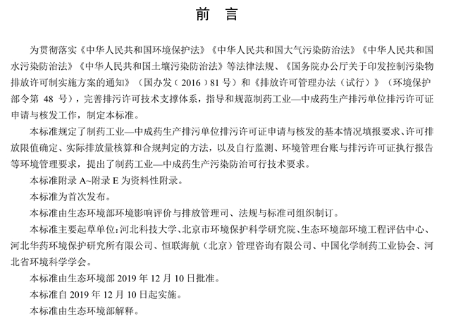 貫徹落實(shí)《中華人民共和國環(huán)境保護(hù)法》《中華人民共和國大氣污染防治法》《中華人民共和國水污染防治法》《中華人民共和國土壤污染防治法》等法律法規(guī)、《國務(wù)院辦公廳關(guān)于印發(fā)控制污染物排放許可制實(shí)施方案的通知》(國辦發(fā)﹝2016﹞81號)和《排放許可管理辦法(試行)》(環(huán)境保護(hù)部令第 48 號),完善排污許可技術(shù)支撐體系,指導(dǎo)和規(guī)范制藥工業(yè)—中成藥生產(chǎn)排污單位排污許可證申請與核發(fā)工作,制定本標(biāo)準(zhǔn)。