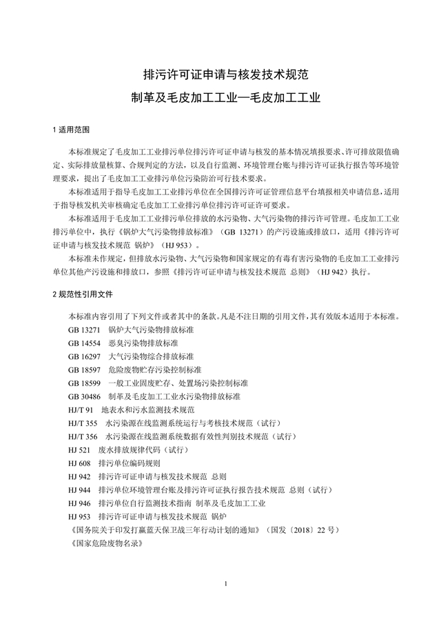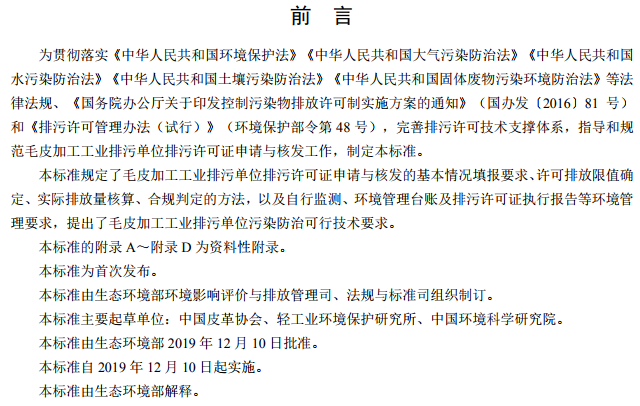 為貫徹落實《中華人民共和國環(huán)境保護法》《中華人民共和國大氣污染防治法》《中華人民共和國水污染防治法》《中華人民共和國土壤污染防治法》《中華人民共和國固體廢物污染環(huán)境防治法》等法律法規(guī)、《國務(wù)院辦公廳關(guān)于印發(fā)控制污染物排放許可制實施方案的通知》(國辦發(fā)〔2016〕81號)和《排污許可管理辦法(試行)》(環(huán)境保護部令第48號),完善排污許可技術(shù)支撐體系,指導(dǎo)和規(guī)范毛皮加工工業(yè)排污單位排污許可證申請與核發(fā)工作,制定本標準。