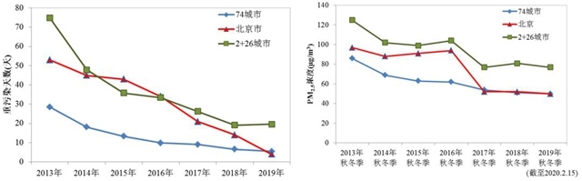 全國74城市、“2+26”城市和北京市重污染超標(biāo)天和秋冬季PM2.5濃度的變化