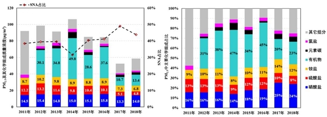 北京2011-2018年秋冬季PM2.5化學(xué)組分濃度及占比年際變化