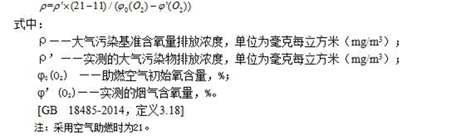 本標(biāo)準(zhǔn)規(guī)定的各項(xiàng)污染物濃度的排放限值,均指在標(biāo)準(zhǔn)狀態(tài)下以11%(V/V%)O2(干煙氣)作為換算基準(zhǔn)換算后的基準(zhǔn)氧量排放濃度,按下式進(jìn)行換算: