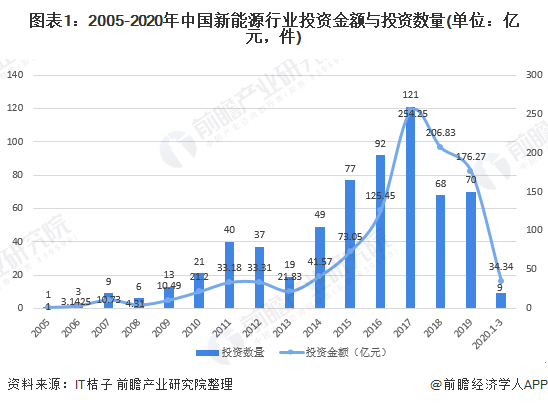 從新能源行業(yè)的投資規(guī)模來看,2005-2019年新能源行業(yè)投資金額呈現(xiàn)倒U型,2017年達到峰值254.25億元,2019年全年新能源行業(yè)的投資金額為176.27億元,同比下降14.78%,2020年1-3月中旬新能源行業(yè)的投資金額達到34.34億元。