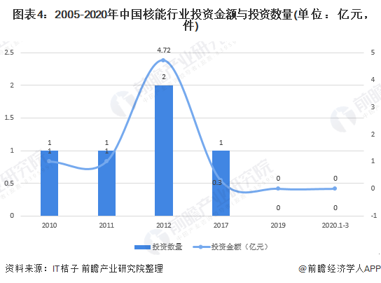從核能行業(yè)的投資規(guī)模來看,2005-2019年核能行業(yè)投資金額呈現(xiàn)倒U型,2017年融資金額0.3億元,2019年全年核能的投資金額為0億元,2020年1-3月中旬核能行業(yè)的投資金額達到0億元。