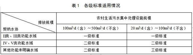5.1.3 根據(jù)受納水體的水域功能與處理設(shè)施規(guī)模,將大于20 m³/d(含)規(guī)模的污水處理設(shè)施水污染物排放標準值分為一級標準、二級標準、三級標準,各標準適用情況見表1。