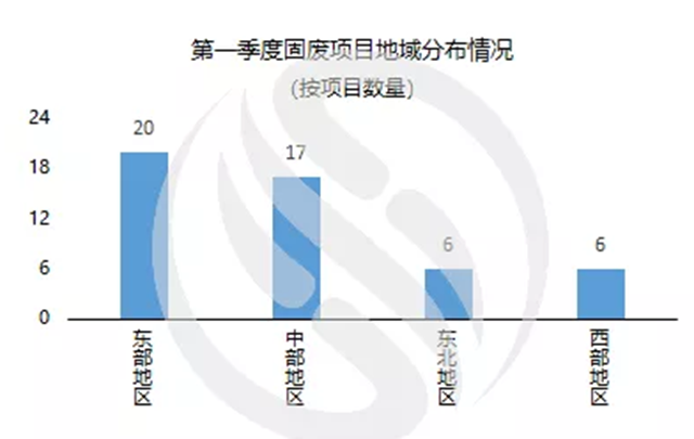 將項(xiàng)目按地域維度劃分,第一季度固廢項(xiàng)目以東部地區(qū)中標(biāo)數(shù)量最多(20個(gè)),其次為中部地區(qū)(17個(gè)),東北地區(qū)和西部地區(qū)各6個(gè)項(xiàng)目。