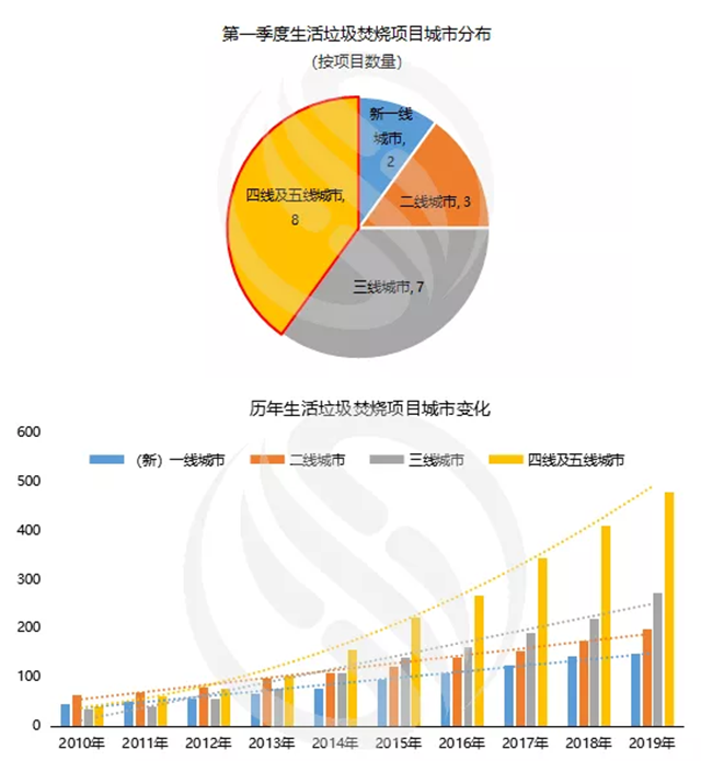 從項(xiàng)目分布維度看,2020年第一季度的生活垃圾焚燒項(xiàng)目主要集中在三線、四線和五線城市。其中:一線城市無新增;新一線和二線城市分別中標(biāo)2個(gè)和3個(gè)項(xiàng)目;三線城市中標(biāo)7個(gè)項(xiàng)目,四線及五線城市中標(biāo)8個(gè)項(xiàng)目,這與E20環(huán)境平臺(tái)執(zhí)行合伙人、E20研究院執(zhí)行院長(zhǎng)、湖南大學(xué)兼職教授薛濤在“2019(第十三屆)固廢戰(zhàn)略論壇”上對(duì)生活垃圾增量市場(chǎng)的預(yù)測(cè)相吻合:一線城市基本瓜分完畢,生活垃圾焚燒市場(chǎng)逐漸向三四五線城市下沉。