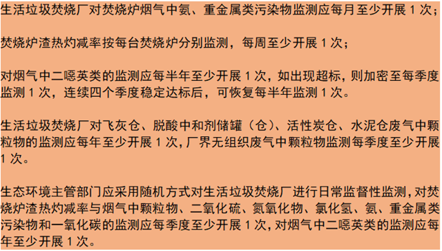污染物監(jiān)測要求:生活垃圾焚燒廠運行企業(yè)要建立企業(yè)監(jiān)測制度,制定監(jiān)測方案,開展監(jiān)測并公布監(jiān)測結果。應根據(jù)監(jiān)測污染物的種類,在規(guī)定的污染物排放監(jiān)控位置進行。在線監(jiān)測結果應采用電子顯示板進行公示并與當?shù)厣鷳B(tài)環(huán)境主管部門和行業(yè)行政主管部門監(jiān)控中心聯(lián)網(wǎng)。煙氣在線監(jiān)測指標應至少包括煙氣中顆粒物、二氧化硫、氮氧化物、一氧化碳和氯化氫。