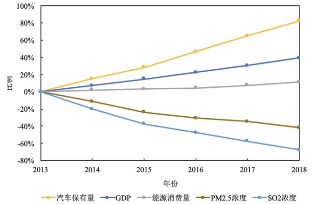 2013–2018年中國(guó)GDP、能源消費(fèi)總量、民用汽車保有量和74城市空氣質(zhì)量變化情況