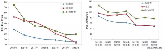 就在剛剛過去的2019–2020年秋冬季,三大重點(diǎn)區(qū)域空氣質(zhì)量繼續(xù)改善,“2+26”城市PM2.5平均濃度同比下降13.6%,重污染天數(shù)同比減少36.2%,長(zhǎng)三角地區(qū)和汾渭平原也都完成了既定的空氣質(zhì)量改善目標(biāo)。2019年,北京市PM2.5年均濃度更是達(dá)到42微克/立方米的歷史低值;重污染天數(shù)僅4天,相比2016年減少近90%。