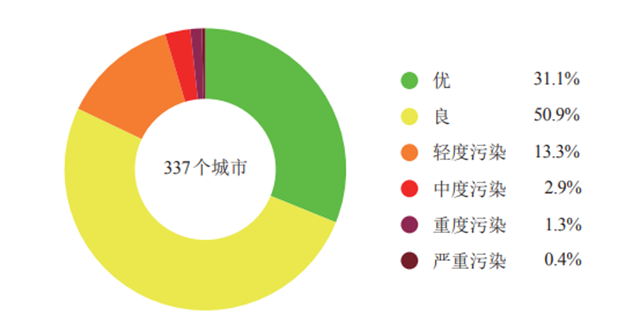 337個(gè)城市平均優(yōu)良天數(shù)比例為82.0%,其中,16個(gè)城市優(yōu)良天數(shù)比例為100%、199個(gè)城市優(yōu)良天數(shù)比例在80%~100% 之間、106個(gè)城市優(yōu)良天數(shù)比例在50%~80%之間、16個(gè)城市優(yōu)良天數(shù)比例低于50%;平均超標(biāo)天數(shù)比例為18.0%,以PM2.5、O3、PM10、NO2和CO為首要污染物的超標(biāo)天數(shù)分別占總超標(biāo)天數(shù)的45.0%、41.7%、12.8%、0.7%和不足0.1%,未出現(xiàn)以SO2為首要污染物的超標(biāo)天。