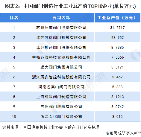 我國閥門制造行業(yè)工業(yè)總產(chǎn)值排名前十的企業(yè)分別為蘇州紐威閥門股份有限公司、江蘇蘇鹽閥門機(jī)械有限公司、江蘇神通閥門股份有限公司、中核蘇閥科技實(shí)業(yè)股份有限公司、遠(yuǎn)大閥門集團(tuán)有限公司、浙江盾安智控科技股份有限公司、河南省高山閥門有限公司、上海凱科閥門制造有限公司、五洲閥門股份有限公司和浙江石化閥門有限公司。