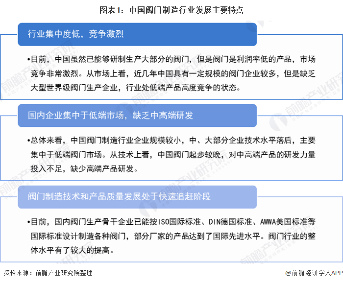 閥門是一種壓力管道元件,它是用來改變管路斷面和戒指流動(dòng)方向、控制輸送介質(zhì)的壓力、流量、溫度的一種裝置,具有導(dǎo)流、截流、調(diào)節(jié)、防止倒流、分流或溢流卸壓等功能,廣泛應(yīng)用于國民經(jīng)濟(jì)的各個(gè)主要領(lǐng)域。從我國閥門制造行業(yè)的發(fā)展特點(diǎn)來看,我國閥門制造行業(yè)集中度較低,競爭相對(duì)激烈,國內(nèi)企業(yè)集中于低端市場,缺乏中高端研發(fā),閥門制造技術(shù)和產(chǎn)品質(zhì)量發(fā)展處于快速追趕階段。