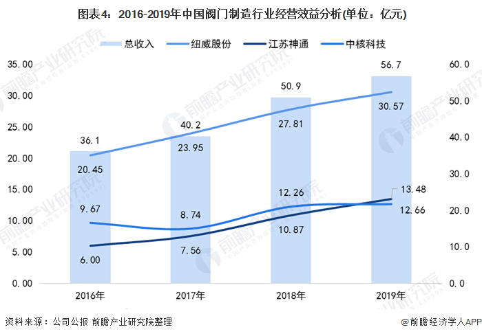 紐威股份、江蘇神通、中核科技等企業(yè)為我國閥門制造行業(yè)的領(lǐng)先企業(yè)。以紐威股份、江蘇神通、中核科技為例,計(jì)算我國閥門制造行業(yè)總體經(jīng)營效益情況。2016-2019年,我國閥門制造行業(yè)營業(yè)收入逐年提高。2019年,三家企業(yè)營業(yè)總收入達(dá)56.7億元,其中,紐威股份營收最高,為30.57億元,其次為江蘇神通,營業(yè)收入達(dá)13.48億元。綜合來看,3家企業(yè)經(jīng)營效益相對(duì)較好。