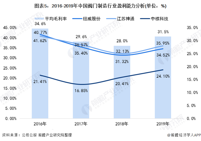 以紐威股份、江蘇神通、中核科技為例,計(jì)算我國閥門制造行業(yè)盈利能力情況。2016-2019年,我國閥門制造行業(yè)平均毛利率波動(dòng)變化。2019年,三家企業(yè)平均毛利率約為31.5%,其中,江蘇神通毛利率最高,為35.95%,其次為紐威股份,毛利率達(dá)34.52%。綜合來看,企業(yè)產(chǎn)品盈利性相對(duì)較高。