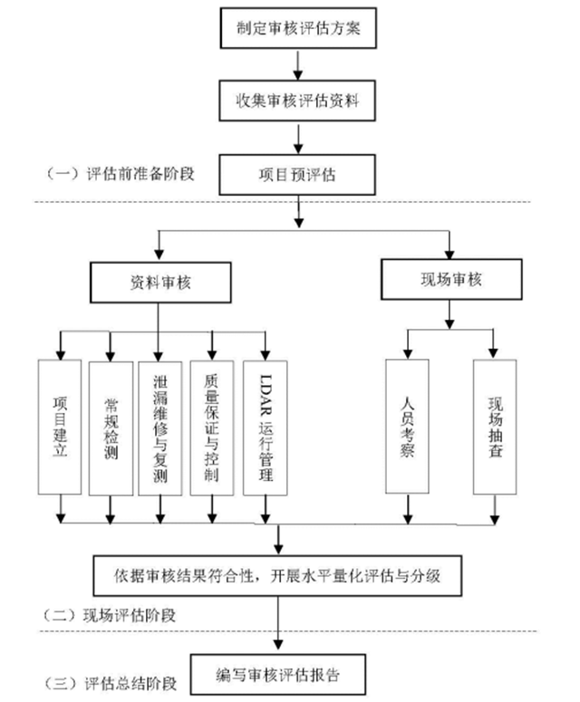 對(duì)企業(yè)揮發(fā)性有機(jī)物泄漏檢測與修復(fù)(LDAR)項(xiàng)目進(jìn)行審核評(píng)估的方法流程,審核評(píng)估形式及要素,審核評(píng)估過程,水平量化評(píng)分標(biāo)準(zhǔn),現(xiàn)場抽查方法與規(guī)則,審核評(píng)估報(bào)告大綱等內(nèi)容及要求。